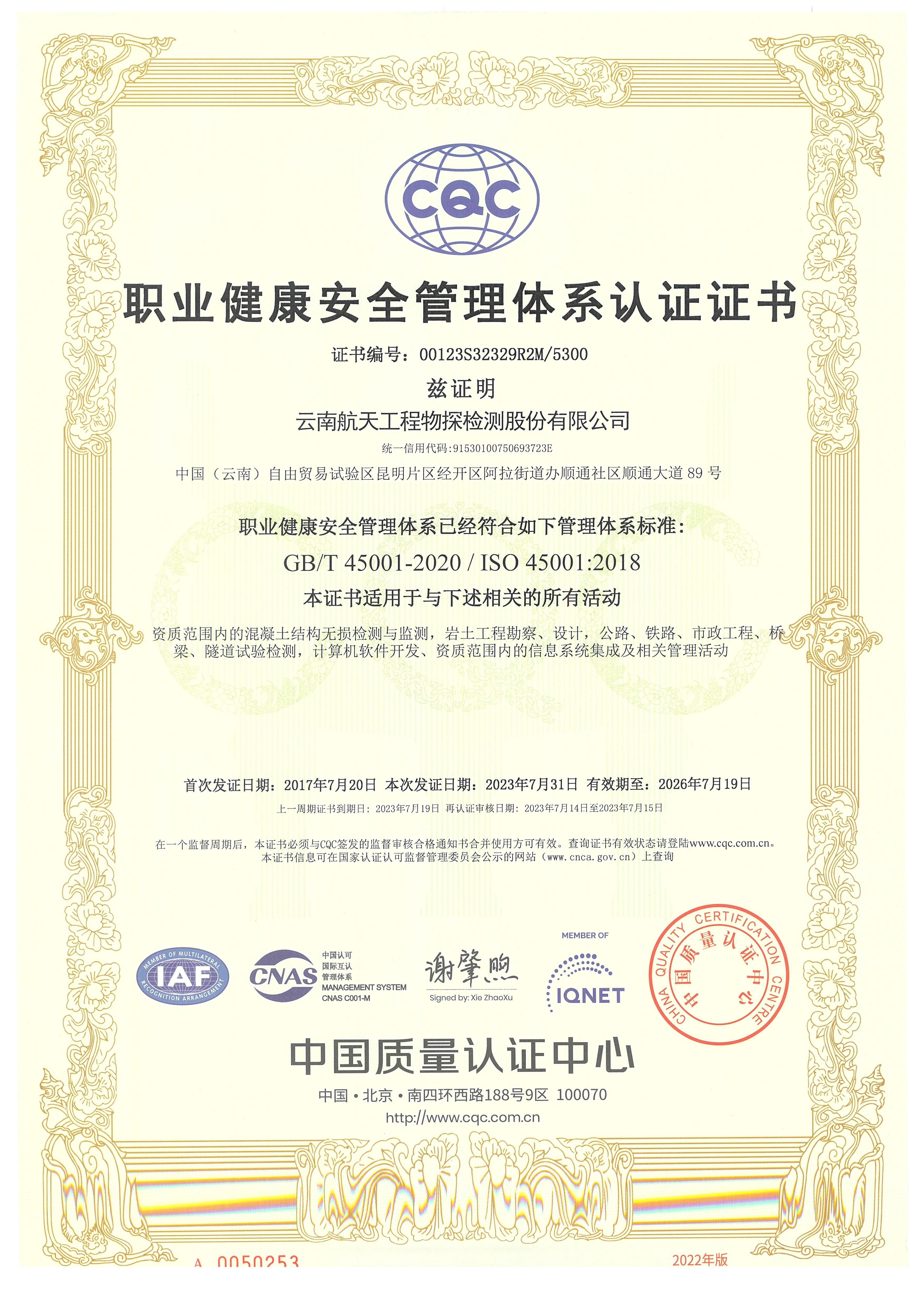 職業(yè)健康安全管理體系認(rèn)證證書